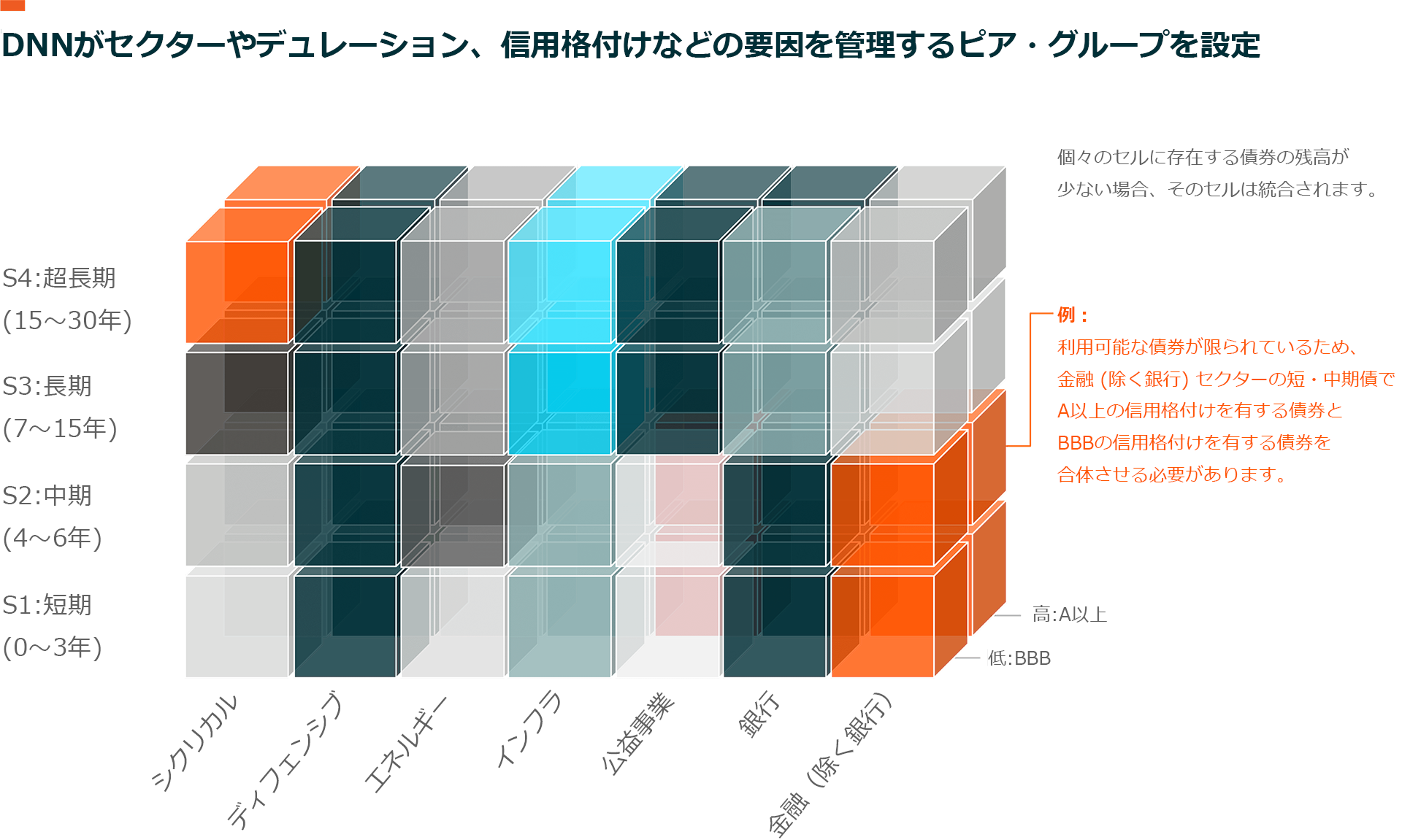訓練プロセスの第1段階では、投資適格社債ユニバースに存在する銘柄をブルームバーグ米国社債指数に基づいて分類します。分析のこの段階での目的は、発行セクターや債券デュレーション、信用格付けなど、銘柄選択の範囲外にある変数を管理することです。各ピア・グループ内でモデルを訓練するのに十分な数の構成銘柄が利用できるようにしないといけないことから、ユニバースは「セル」と呼ばれる35のサブグループに分割されます。