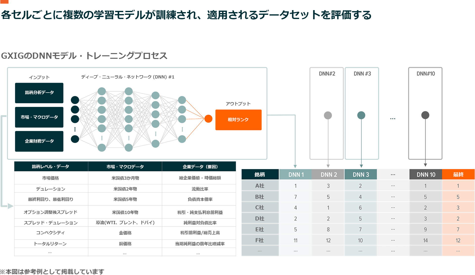 - GXIGのディープラーニング・モデルは、分析のための最適なアーキテクチャを構築して銘柄の期待リターンを予測するように設計された4段階のプロセスを通じて訓練されます。