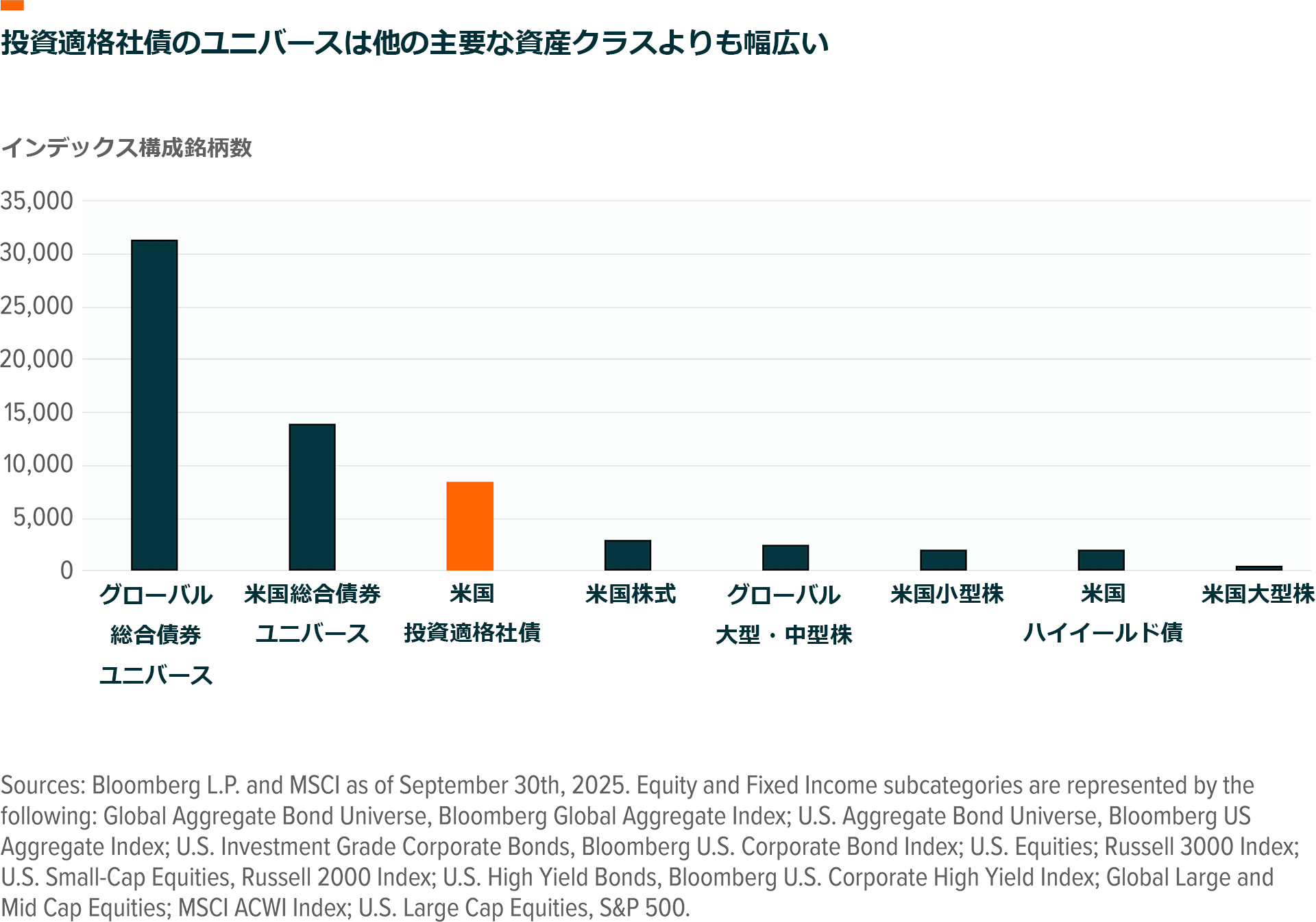 2025年9月30日現在、ブルームバーグ米国社債指数は約8,500の債券で構成されています1。これらの銘柄の一部は、従来のスクリーニング手法を用いたポートフォリオにおいても初期分析の対象とならない場合もありますが、ユニバースに含まれた証券の投資機会を順位付けする作業も、なお多くの時間と労力を要します。構成銘柄数を名前に含む代表的な株価指数であっても、これほど大きなグループと比べると、その規模は全体的に見てかなり小さいことが分かります。ハイイールド社債の数でさえ、上記合計の4分の1程度に過ぎません。さらに、非常に多くの要因が分析の対象となり、適切な市場環境で適切なグループに適用されることをも踏まえると、判断に必要とされる分析の深さは手に負えないレベルになると考えられます。
