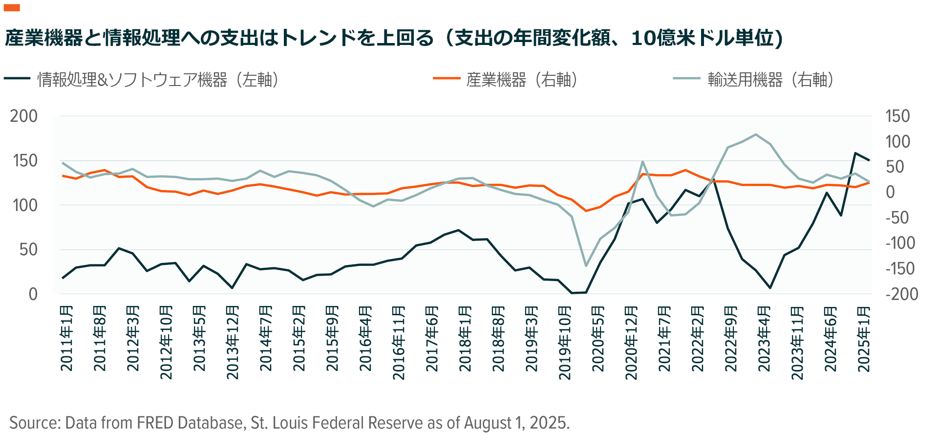 また、建設会社は何年も前からコンピューター支援ツールを使用していますが、新たなAI活用事例も現れていることから、今後も期待されています。エネルギー機器・製造会社のGE ベルノバが買収計画を発表したフランスのソフトウェア企業Alteia SASは、送電線や送電構造の写真を使用して暴風雨による被害を評価するAIシステムを開発しました9。この情報に基づき、電力網を管理する企業は、より迅速に修理を行い、最も脆弱な地域のリスク軽減に一層素早い対応をとることができます。2025年第2四半期の米国内投資のニュースで目立ったものは特段ありませんが、(ソフトウェアを含む)情報技術と産業機器への投資はともに過去最高に近い水準で増加しています10。