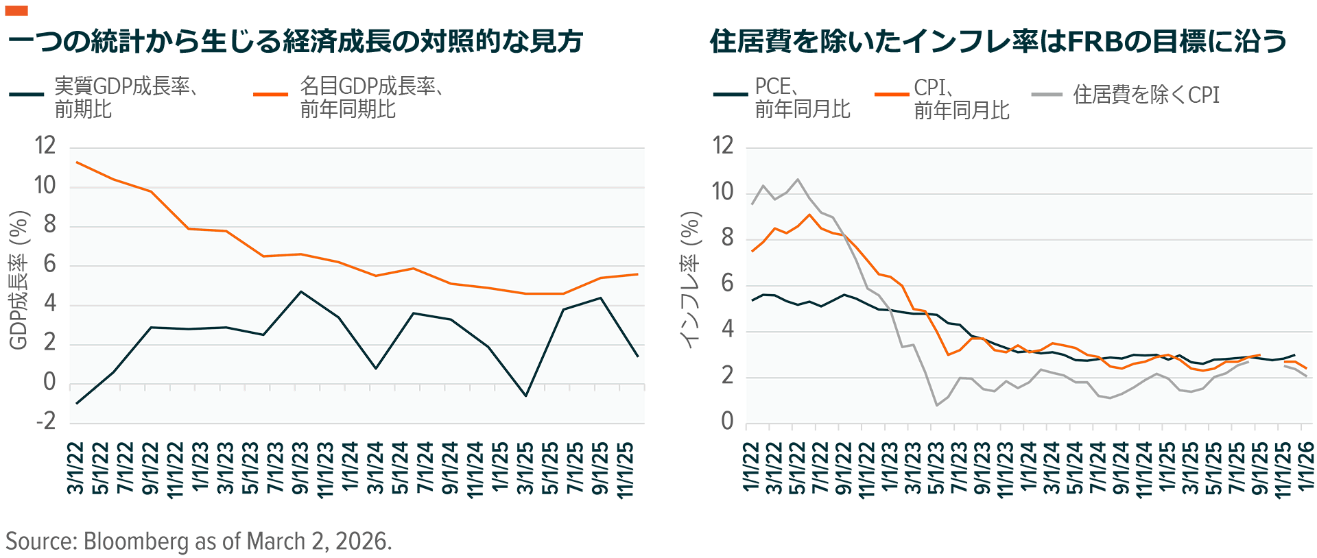観点を変えると、第4四半期に経済成長が加速したと主張することもできます。前年同期比では名目成長率は5.4%と、第3四半期の5.4%からわずかに改善しました7。消費は同5.0%増、非住宅投資は同7.9%増と、景気拡大期が続いていることを示唆しました。2月のCPIも異なる様相を示しています。総合CPIは2.5%でしたが、住居費を除いたCPIは2.1%と、FRBの目標をほぼ達成しました8。これらの結果を総合すると、経済は安定した物価の下で妥当なペースで拡大しています。