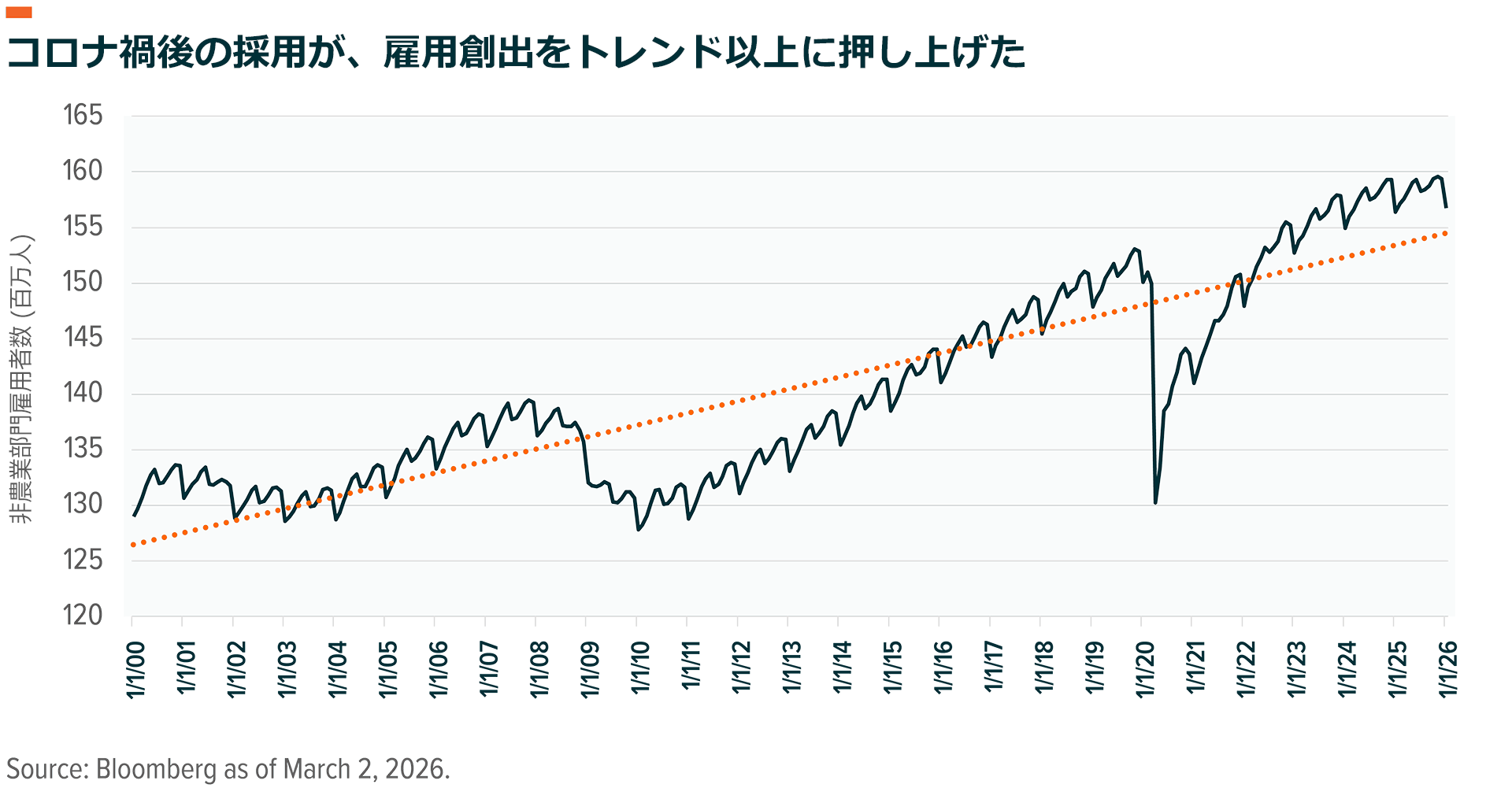 ただし、労働市場が変動要因となり、FRBを利下げに向かわせる可能性があります。雇用者数の伸びは何か月もトレンドを下回っており、2000年は月平均9万人の増加であったのに対し、2025年の増加は1.5万人にとどまりました10。この傾向は一見問題があるように見えるかもしれませんが、パンデミックによる歪みを考慮するとそれほど深刻な問題ではないと考えられます。コロナ禍での経済活動停止の間に米国経済は過去最速のペースで雇用を減らしましたが、その後の18か月間では過去最速のペースで雇用を取り戻しました。その結果、トレンドを上回る雇用が創出されました。