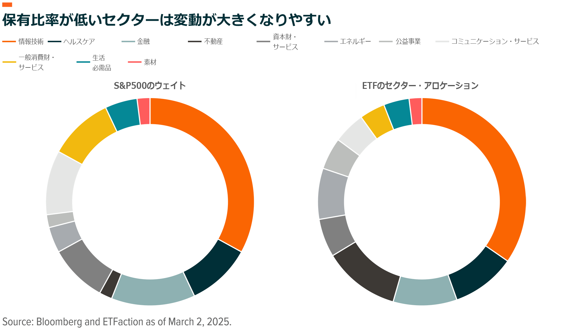 今年これまでの株式市場における最も重要なトレンドは、ローテーションの進行によって、指数全体では比較的落ち着いているにもかかわらず、勝ち組と負け組の間で大きなばらつきが見られることです。保有比率が低いセクター、その中でも指数に占めるウェイトが低いセクターでは、わずかな資金流入でも相場を大きく動かすことがあります。ETFのセクター別保有比率をS&P500のウェイトと比較すると、テクノロジーとヘルスケアの保有比率が他のセクターに比べて依然として高い状態にあります14。