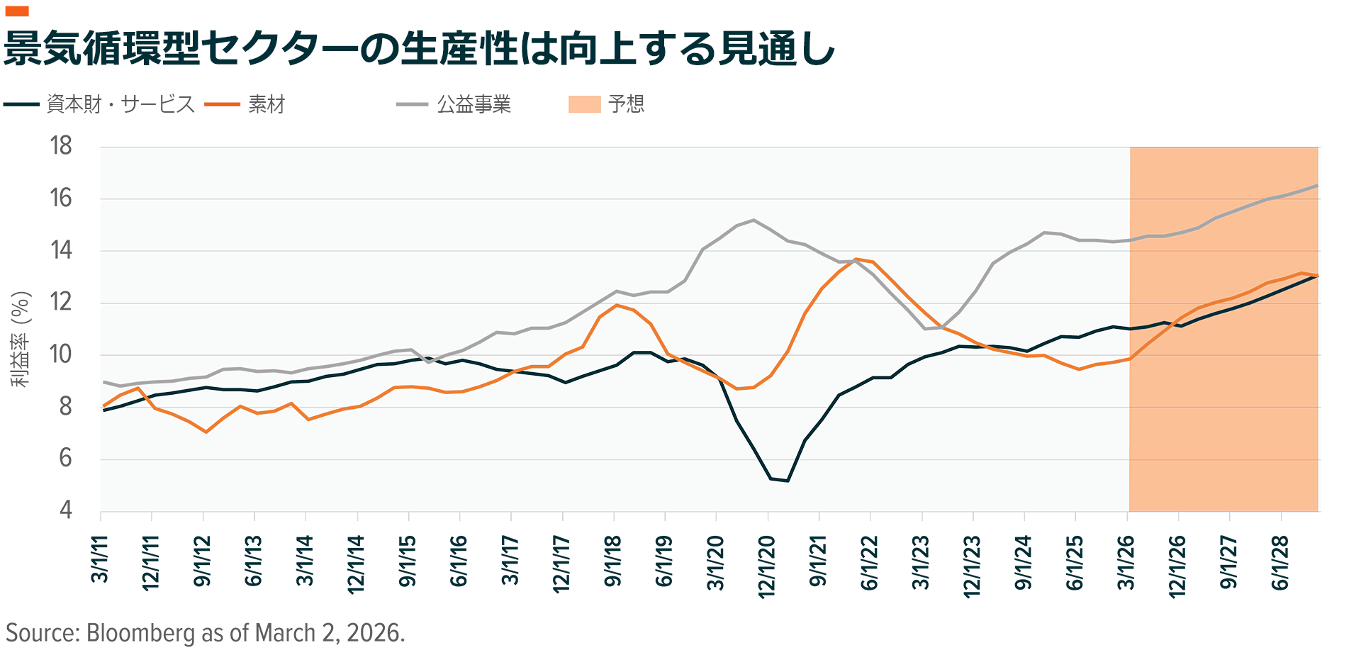 資本財・サービスや素材といった景気循環型セクターの売上高成長率と利益率は今後3年間で大幅に改善する見通しです。公益事業セクターまでもが注目を集めています。これらのセクターの今後3年間の予想成長率は今や2~3%高くなっています16。また、利益率は過去最高を更新する水準にまで上昇すると予想されています。