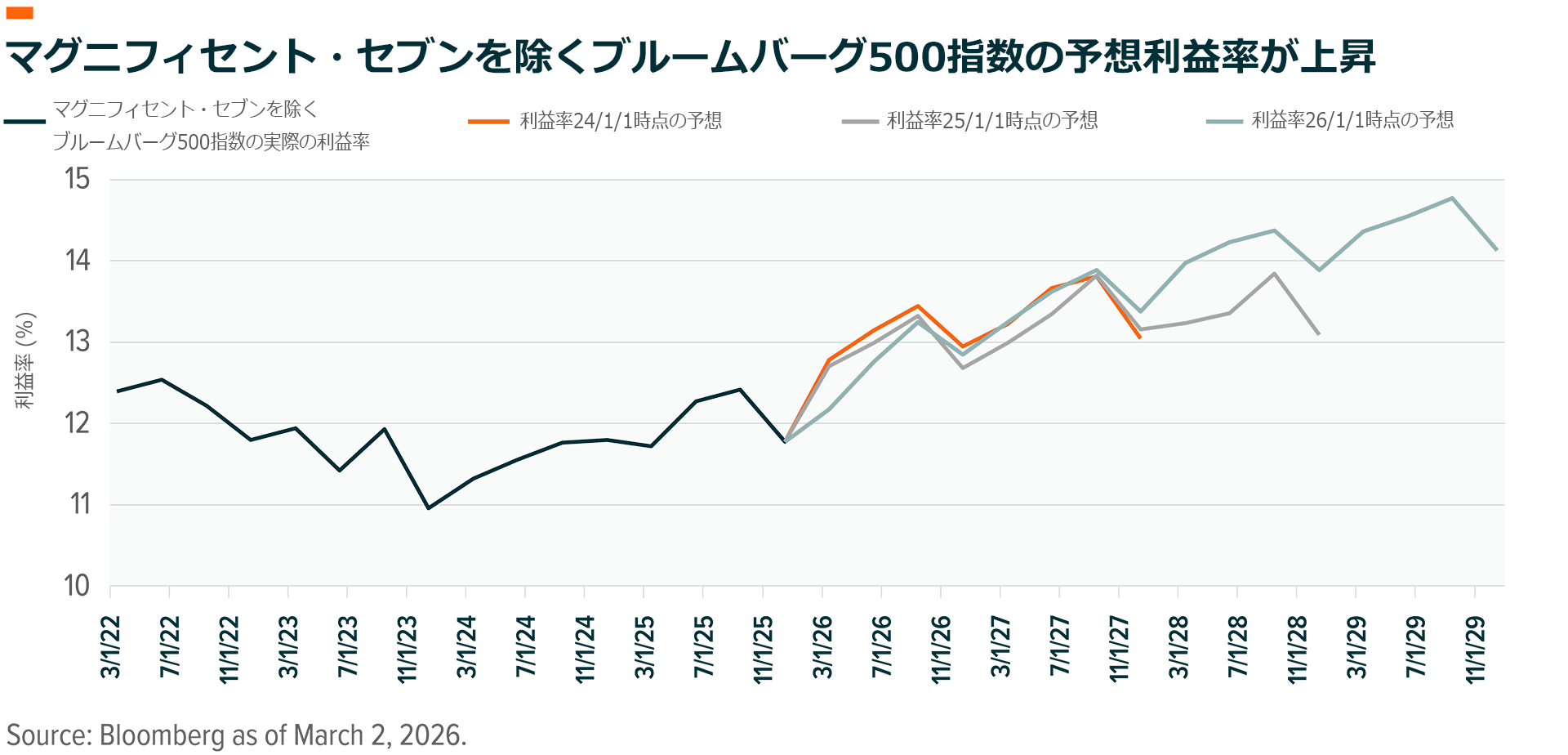 これは、グローバルXが過去2年間語ってきた経済の裾野拡大にほかなりません。留意すべきは、より多くの企業が自動化とAIの導入により生産性を向上させることです。他の産業の生産性向上にとって不可欠であるテクノロジー株の売却はこの相互依存関係を無視しています。マグニフィセント・セブンを除くブルームバーグ500(B500)指数構成銘柄の2026年の予想利益率は、AIによる効率化を分析に組み込むアナリストが増えたことで、2025年から2026年にかけて大幅に上昇しました17。景気敏感株がこの数字を達成するためには、AI企業が確実に成果を出す必要があります。