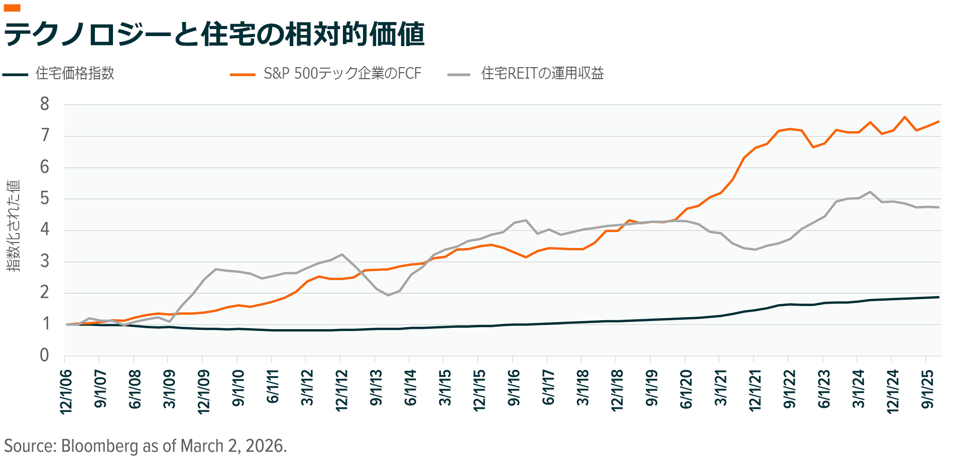 ファイナンスが問題となるのは、裏付けとなる資産の価値が上昇しない、あるいは信用供与を正当化できるほどのスピードでキャッシュフローが成長しない場合に限られます。これは2008年に、かなり緩慢なペースで値上がりするのが一般的である住宅市場において証明されました。対照的に、テクノロジー分野への投資は、歴史的に見てはるかに速いキャッシュフロー成長を生み出してきました22。旺盛な需要の伸びが見られる企業、すなわち大規模言語モデルやそれを支えるデータインフラの分野に対して、株式出資や与信枠を提供することは必ずしも循環的な罠に陥ることを意味するものではありません。