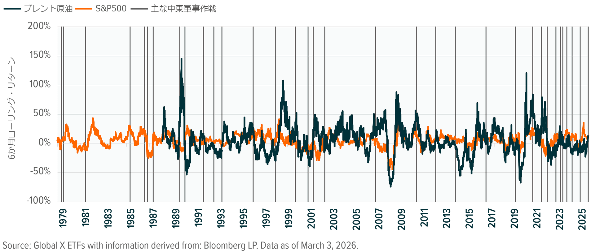 中東で地政学的混乱が起きると原油価格が変動する傾向がありますが、長期的には需給要因が優勢となる傾向があり、1980年以降の中東での軍事行動を振り返ると、原油価格は6か月で平均3%下落しています8。さらに、原油高が米国のインフレやFRBの政策に及ぼす影響については、おそらく過剰反応だと思われます。エネルギーコストの上昇は通常、経済成長を鈍化させ、最終的に需要の減少につながります。FRBにとって、エネルギー価格主導の一時的なインフレ率上昇よりも、労働市場の減速のほうが大きな懸念材料になるかもしれません。