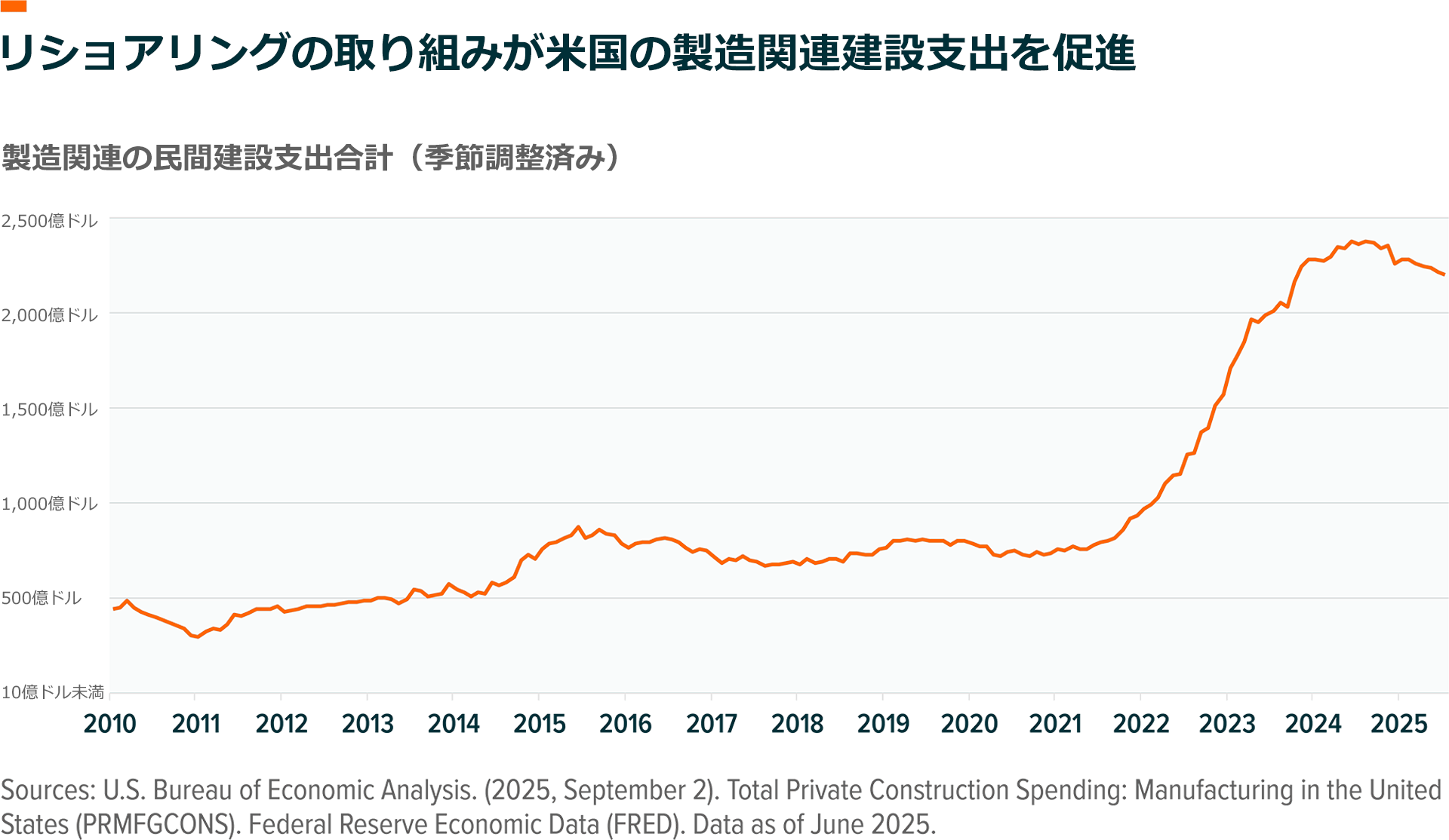 貿易政策や地政学的緊張からサプライチェーンの強靭化、政府による促進策まで長期的な構造要因が一体となって、リショアリングとおそらく記録的な規模となるインフラ投資を推進する見込みです。その結果生じる米国の製造拠点の拡大は、インフラ開発バリューチェーン全体にわたって企業に大きな潜在的収益機会をもたらす可能性が高いとみられます。