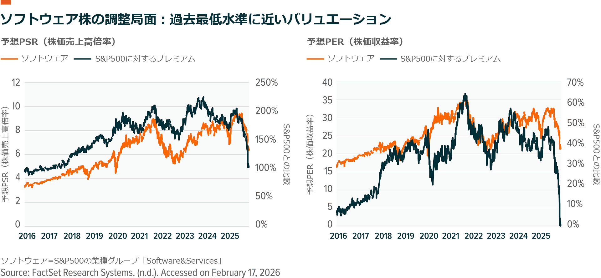 ソフトウェア分野では、企業は汎用的なユーザー単位のライセンスの購入を減らす可能性がありますが、AIモデルとデータをつなぐ仕組みや、AIエージェントの動きを管理・統制するシステム、セキュリティを確保するための分野への投資は引き続き行われると考えられます。今回の急落後の状況は、セクター全体の縮小というよりも、企業ごとの優劣がよりはっきりと分かれる局面といえそうです。