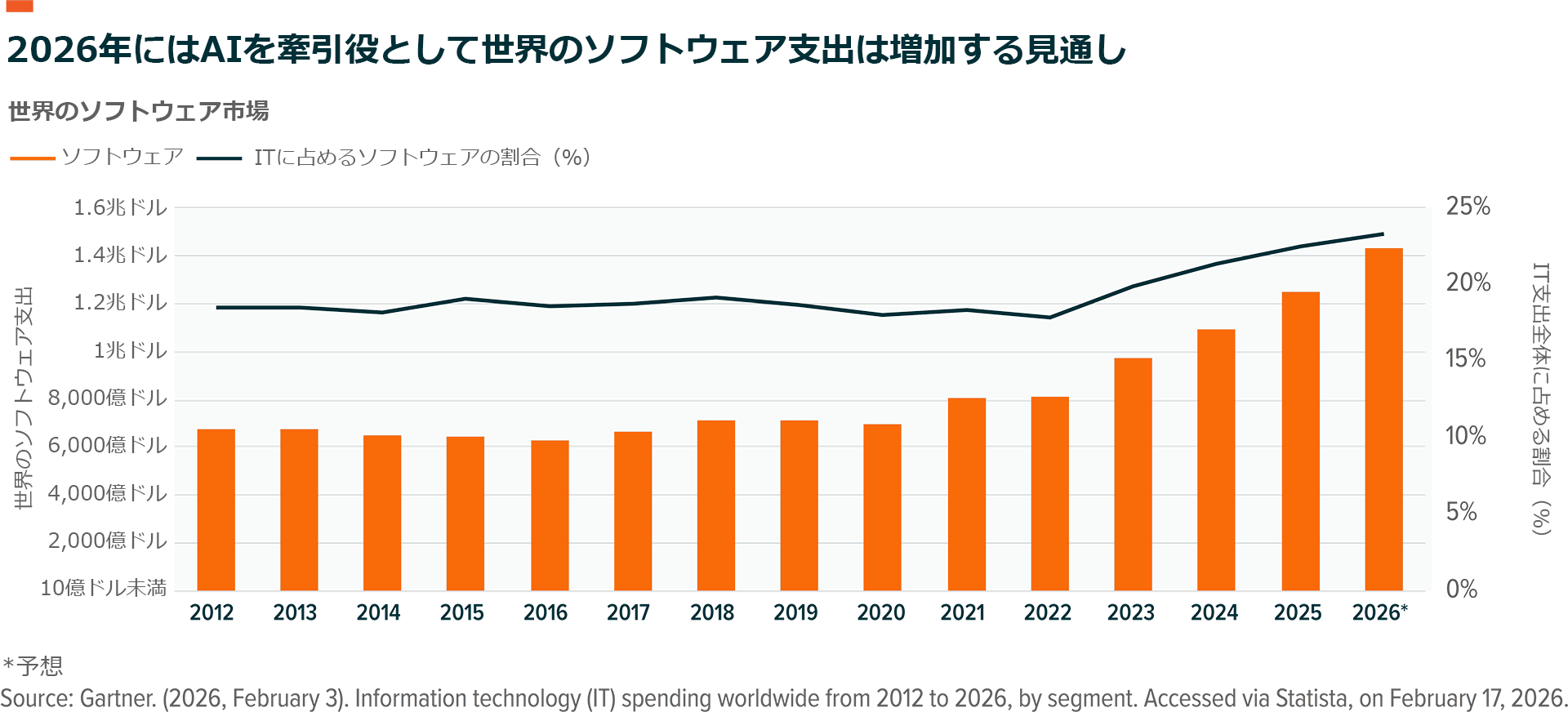 直近のボラティリティから一歩引いて、企業の予算項目の内訳に目を向けると別の実態が見えてきます。世界のIT支出は総額6兆ドルに達する見込みであり、そのうちソフトウェア支出は約1.43兆ドル(約230兆円)で、前年比で14.7%増加しています。このデータに基づくと、ソフトウェアはIT支出全体の23%強を占めており、依然として最も急成長している主要カテゴリの1つです6。さらに、生成AIモデルへの支出は2026年に約80.8%増加することが引き続き示唆されており、市場では破壊的変化のリスクが議論されているものの、AI関連ソフトウェアは急拡大していることがわかります7。