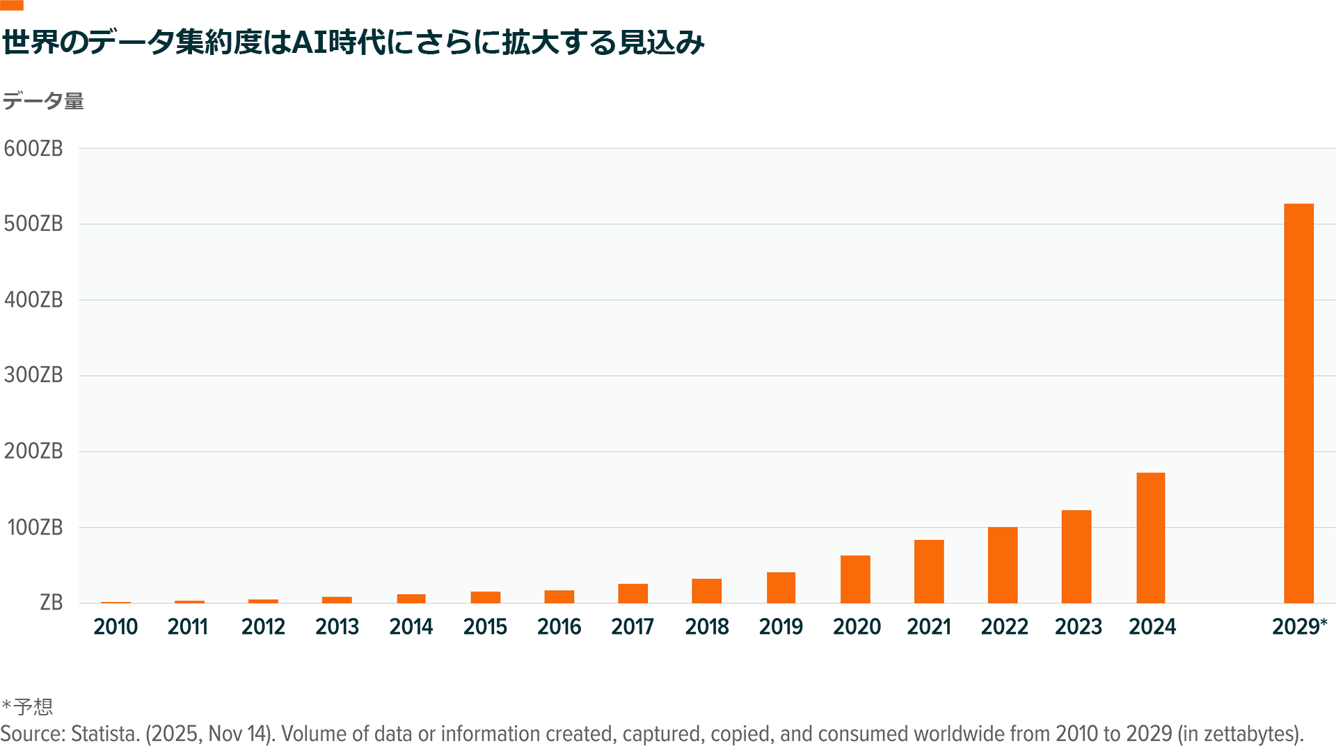 第三に、ソフトウェアの役割は、これまで常に、増大するデータ量を実用的な形に変換すること、つまり情報の保存、保護、移行、解釈を担うシステムに転換することにあり、その根本的な原動力は減速していません。世界で作成、消費、保存されるデータは、2024年の約173ゼタバイトから2029年までに約527ゼタバイトへと254%増加すると予測されています9。この急増は、AIの圧倒的なデータ量を反映しています。この方向性が正しいのであれば、その過程でソフトウェア支出が縮小する可能性は低いと考えられます。