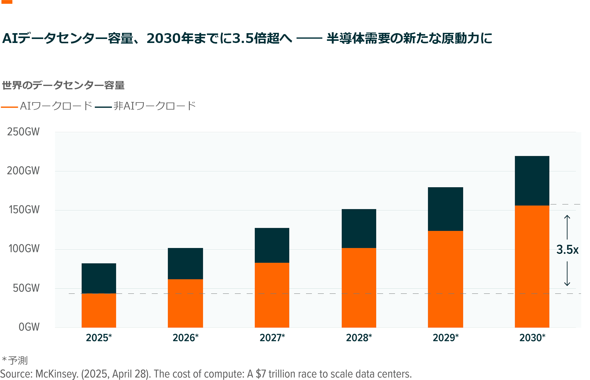 2025年6月の米国データセンター建設費は2024年の50%増に続き、季節調整年率で400億ドル(約6兆円)に達し、前年同期比で約30%の増加を記録しました7。このブームは、生成AIや機械学習のワークロードに対する需要の加速が主な要因で、これらが電力網やコンピュータインフラに負担をかけています。この成長の大部分は、マイクロソフト、アマゾン、グーグル、メタといった大手テック企業のハイパースケーラーによる巨額の投資が担っています。例えば、マイクロソフトは9月に米東北部ウィスコンシン州にハイパースケールAIデータセンターを建設するための33億ドル(約5,000億円)の計画を含め、今後3年間で40億ドル(6,100億円)を投資することを発表しました8。全体で、ハイパースケーラーの設備投資は2025年に約4,000億ドル(約61兆円)に達すると予測され、その大部分がデータセンターに向けられる見込みです9。そして、この建設ブームの規模は、AI競争がどれほど激化しているかを物語っています。もはや優れたモデルを作ることだけではなく、それを訓練し展開するための物理的なインフラを所有することが重要になっています。