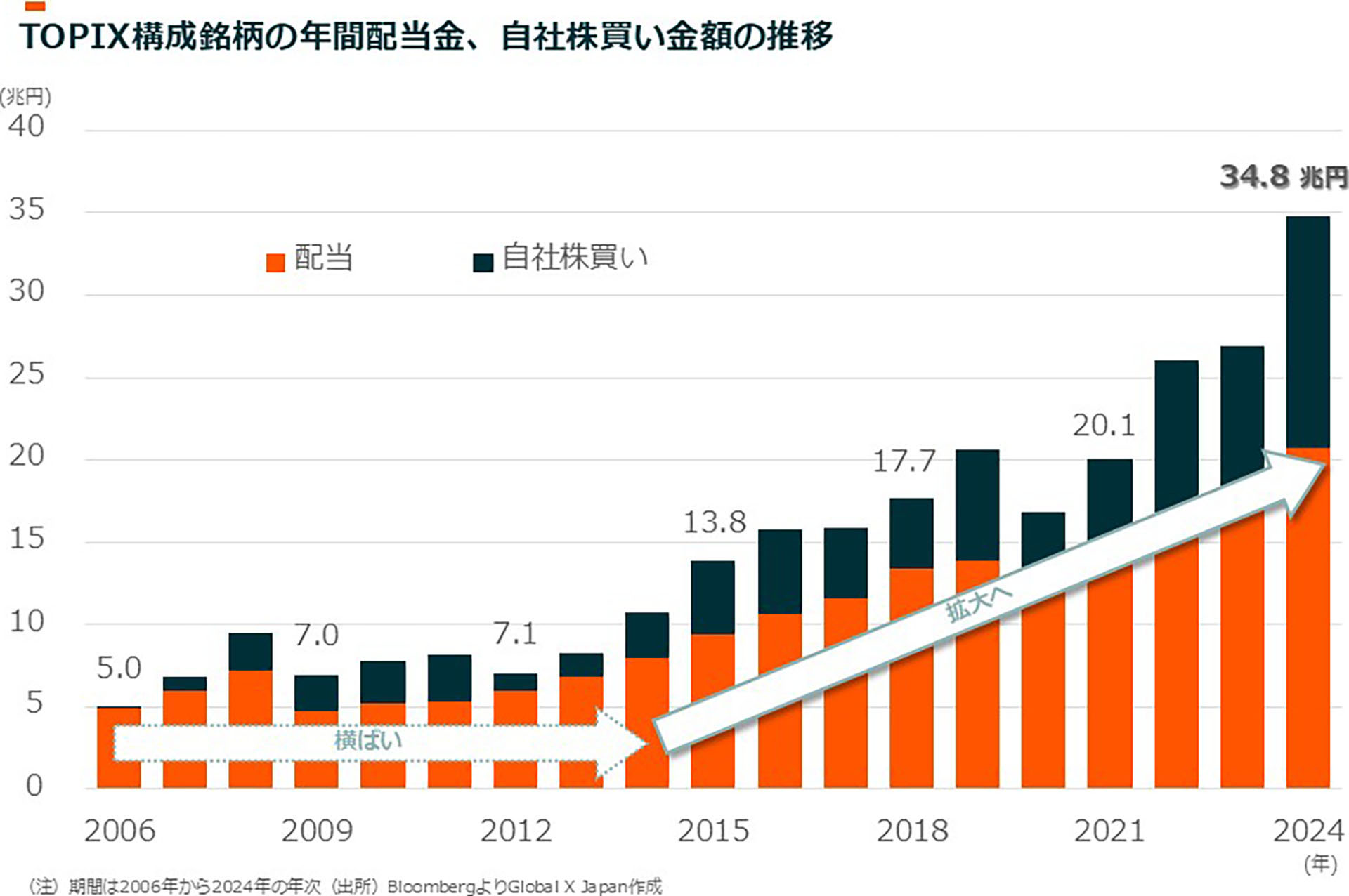 しかしながら、日本ではこれまで経済の低迷が長引いたことや、銀行や取引先等の安定株主に守られていたこともあって、企業は株主還元などの資本効率の向上にあまり積極的ではない傾向がありました。その姿勢に変化をもたらしたのが、政府主導のもと行われたガバナンス改革です。2014年に当時の安倍政権が日本版スチュワードシップ・コードを制定して以降、各種機関から資本効率の改善に向けた様々な取り組みが行われてきました。その結果、TOPIX構成企業の配当と自社株買いを合わせた総株主還元額は、2024年に約34.8兆円と過去最高を記録しています。