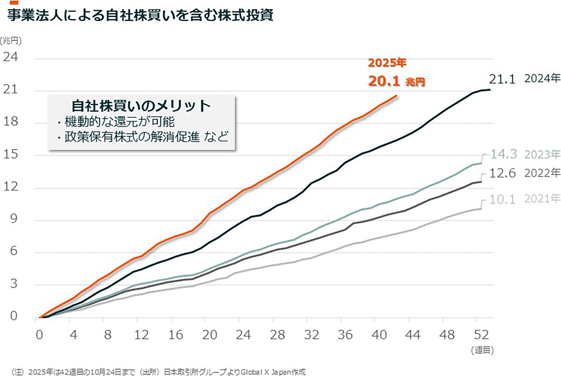 特に自社株買いの増加が目立っています。事業法人による自社株買いの金額は、年を追って増加している状況です。自社株買いは配当よりも機動的に株主還元を行うことが可能です。また、資本効率の観点から政策保有株式の削減圧力が高まっていることもあり、今後も高水準な自社株買いが続くと期待されます。
