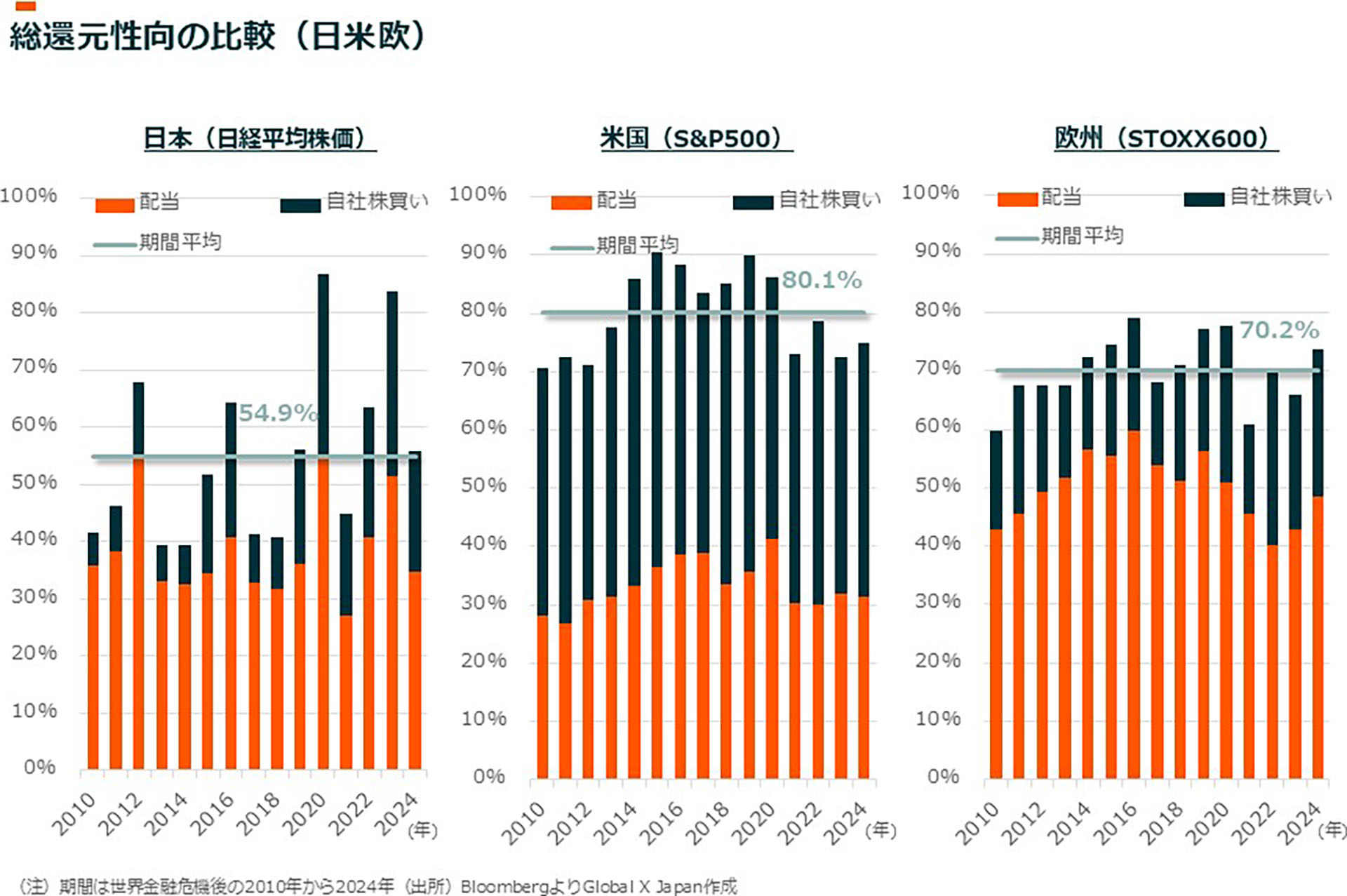地域によって株主還元の構成が多少異なりますが、日本企業の株主還元は相対的に少なく、依然として多くの現金同等物等を有していることから、引き続き株主還元を拡充する余地が十分にあると考えられます。
