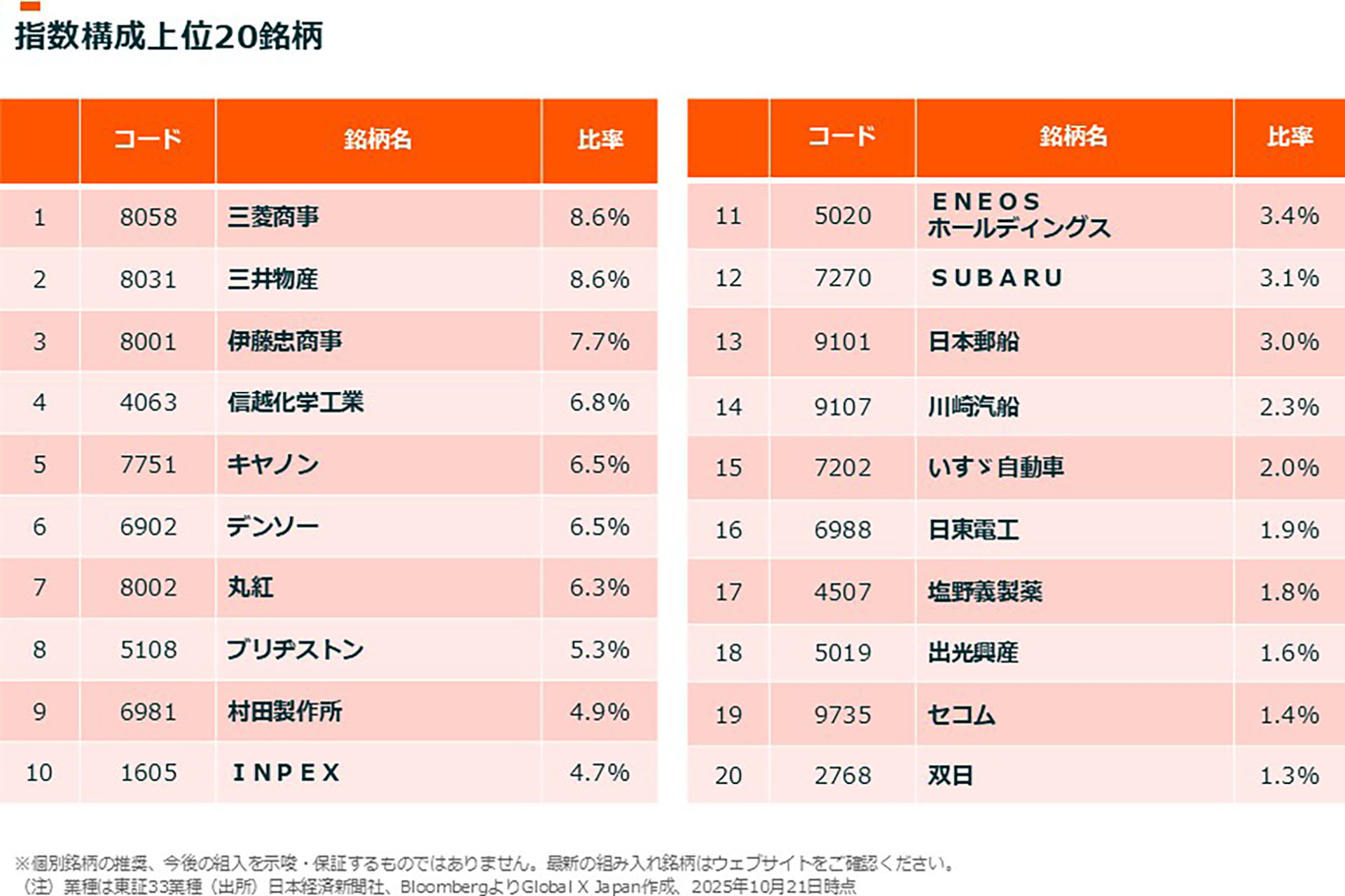 日経平均株主還元株40指数の構成上位には、成長投資と株主還元の両輪での成長を掲げる総合商社の三菱商事や三井物産、伊藤忠商事のほか、安定配当と機動的に自社株買いを行うデンソーやブリヂストンなどとなっています。このようにグローバルX 日経平均株主還元40-日本株式 ETF(465A)では、豊富なキャッシュフローを元に持続的な株主還元が期待される日本の大型株への投資が可能です。