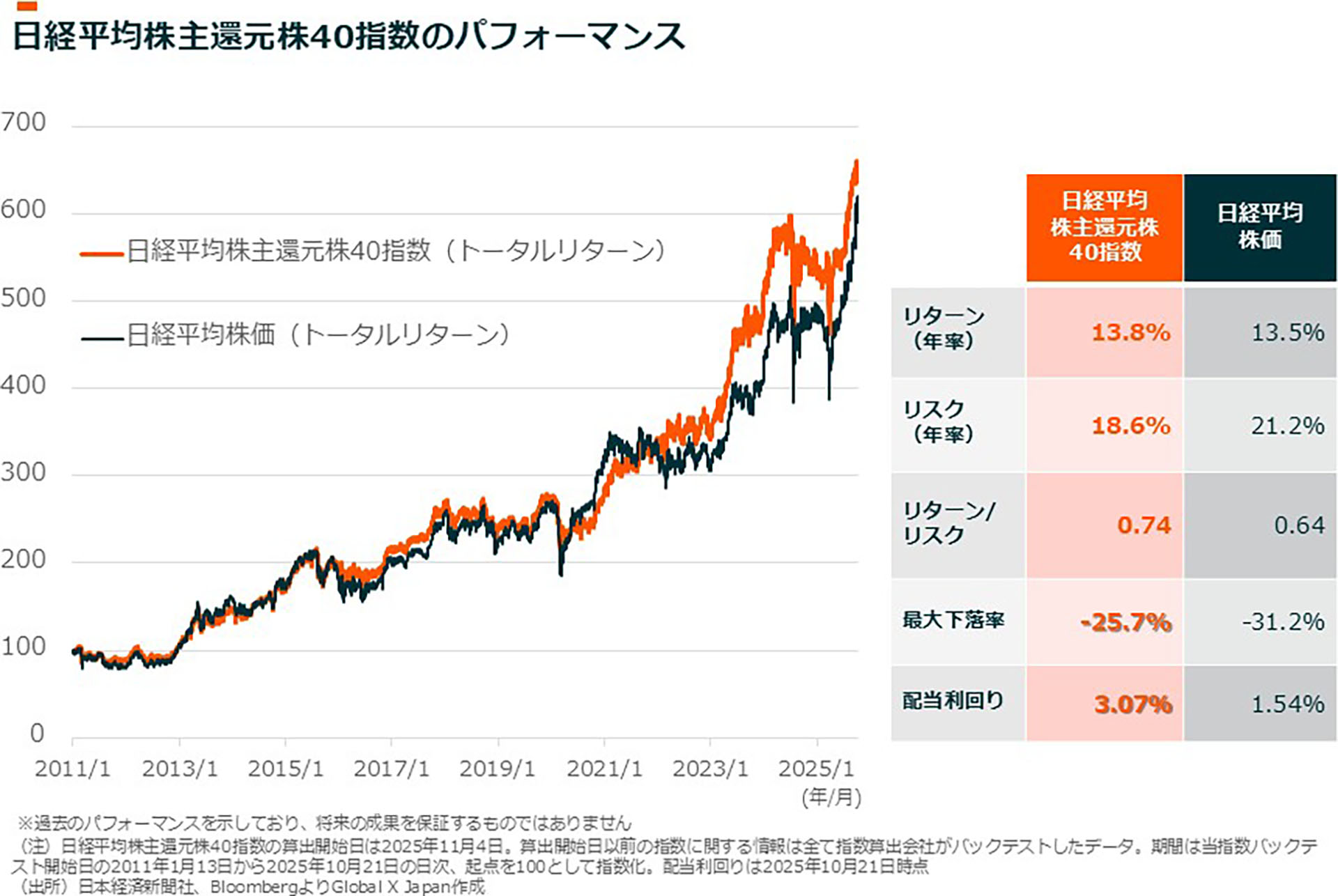 株主還元は企業価値を高めるための重要な経営戦略の一つであり、近年、日本企業でも株主還元の拡充が活発化しています。日経平均株主還元株40指数では、財務健全性を保ちつつ持続的な株主還元が期待できる優良企業を選別し、相対的に安定したパフォーマンスや高い利回りが期待されます。